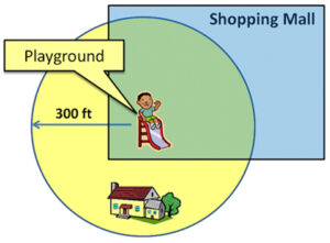 Passed in 2008 (S.L. 2008-117), the 300-foot rule prohibits covered offenders from going near certain locations within places. It effectively tells the registrant, “You can go to places like the mall, you just can’t go within 300 feet of the playground within the mall.” That sounds easy enough, but there are some complications. First, which locations qualify as locations “primarily for the use, care, or supervision of minors” under this law? It seems like a clearly demarcated play area within a larger, non-kid-specific place would be covered. That would appear to render just about any fast-food restaurant with a play area entirely off limits—the play area is primarily for minors and the restaurant as a whole is not. Even the largest of restaurants (except maybe that giant McDonald’s that spans the Will Rogers Turnpike in Oklahoma) would almost certainly be swallowed up by the football field–sized radius drawn around any play area on site. Would a single coin-operated ride also qualify as a location for the use of children? In a multi-story mall can a covered registrant knowingly be in the areas above or below the play area? What about a shallow “kiddie area” in a public pool? Is that a location with a broader place (the pool as a whole) such that covered offenders cannot come within 300 feet of it? A play apparatus for children located within a broader park used by adults and children alike? A juvenile area within a bookstore or library? These are all actual questions I’ve been asked.