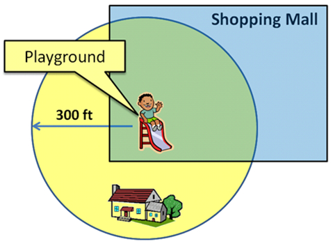 To further complicate things, what if (as depicted in the figure) a covered registrant’s home falls within the portion of the 300-foot radius that lies outside the mall? Does the 300-foot restriction then operate like a residency restriction? North Carolina has explicit residency restrictions under G.S. 14-208.16, which prohibits registrants from residing with 1,000 feet of schools and child care centers, as those places are defined by law. Again, it would be strange if the 300-foot rule operated as a more restrictive residency restriction than the residency restriction itself. It also bears mentioning that the 300-foot rule does not include the grandfather clauses built into G.S. 14-208.16 that exclude offenders who established a residence before residency restrictions came into effect on December 1, 2006 (see S.L. 2006-247, sec. 11) or who lived in a place before a school or daycare opened up nearby. Without those exemptions, an offender forced to move out of his or her property might have a valid claim under the Takings Clause. See, e.g., Mann v. Georgia Department of Correction, 282 Ga. 754 (2007) (holding Georgia’s residency restriction law constituted an impermissible taking as applied to a sex offender who was forced to move after a child care center opened near his home).
