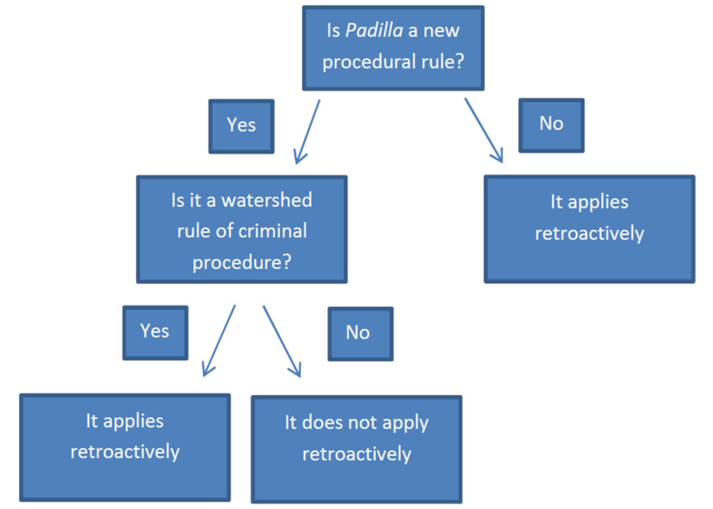 Padilla has generated a lot of post-conviction litigation nationally. And in North Carolina it’s no different—numerous motions for appropriate relief have been filed alleging that counsel was ineffective under Padilla by failing to properly advise defendants regarding the immigration consequences of their pleas. For defendants whose convictions became final prior to Padilla, retroactivity is a preliminary issue presented by those motions. As I discuss in more detail in a bulletin available here, under federal law a new rule of criminal procedure does not apply retroactively unless it is a watershed rule of criminal procedure. Put in visual form, retroactivity analysis for Padilla follows this path: