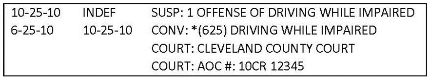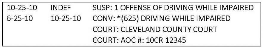 The revocation period is permanent for a person convicted of impaired driving who previously has been convicted of two or more offenses involving impaired driving, with the most recent of those offenses occurring within five years before the date of the offense for which the person’s license is being revoked. G.S. 20-19(e). No conviction more than ten years old may be considered (unless the offense occurred in a commercial motor vehicle or was committed by the holder of a commercial driver’s license). G.S. 20-36. All other revocations for conviction of impaired driving under G.S. 20-138.1 are for one year. G.S. 20-19(c1). The “1” beside “OFFENSE OF DRIVING WHILE IMPAIRED” indicates that DMV considers this a first conviction for revocation purposes.