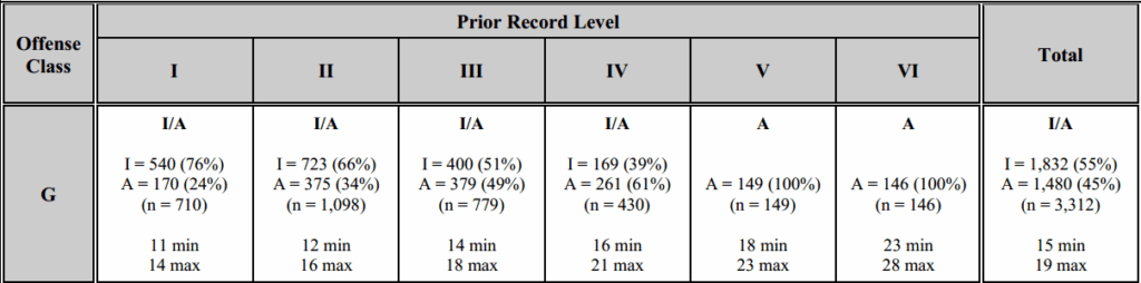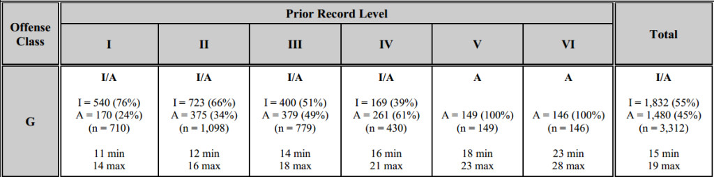 Judges, the report provides a window into your collective sentencing practices—which is helpful, because you don’t always have an opportunity to converse with your peers. Table 4 (p. 13–14) is particular favorite of mine, showing the average minimum and maximum sentence and dispositional prevalence (that is, the relative use of active, intermediate, and community punishments) in every cell on the grid. Here is a snippet for Class G: