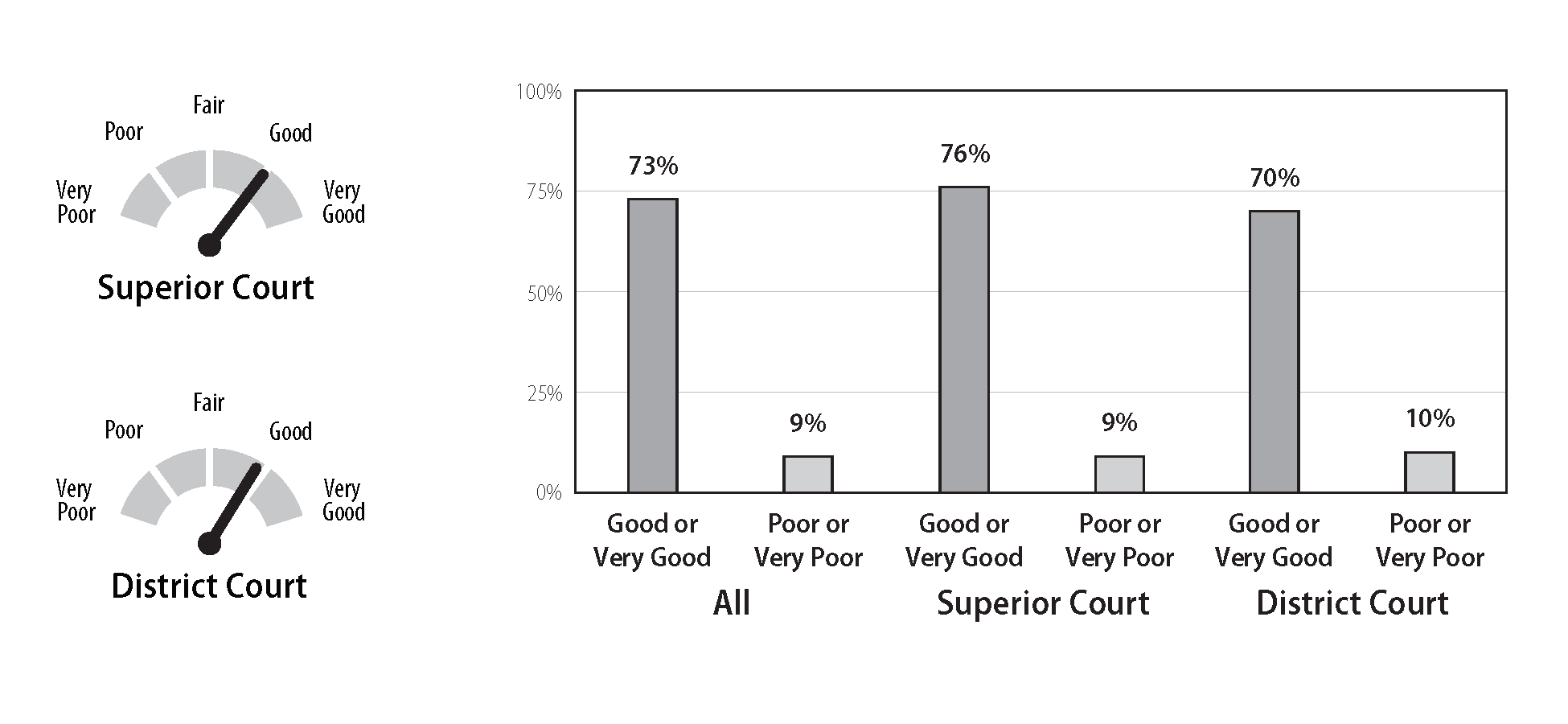 Concluding observations. The Report concludes that the judges’ responses to the closed-ended questions (those calling for ratings) “contain many indicators of a healthy system.” See Report at p. 31. Among other things, “the number of positive assessments—‘Satisfied’ or ‘Very Satisfied’ in some questions, ‘Good’ or ‘Very Good’ in others—tended to greatly outnumber the negative ones.” Id.
