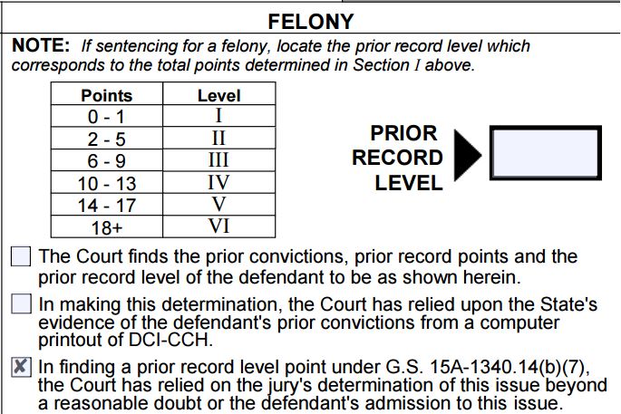On appeal, the defendant argued that including the bonus point was improper because the State didn’t follow the statutory procedures related to it. Specifically, the State failed to provide him with written notice of its intent to prove the point at least 30 days before trial or entry of a guilty or no contest plea, as required by G.S. 15A-1340.16(a6). The State argued that it satisfied the notice requirement by giving the defendant a copy of the prior record level worksheet (AOC-CR-600B) more than 30 days before trial. Moreover, the State argued, the worksheet included a stipulation as to the defendant’s “prior convictions, points and record level.”