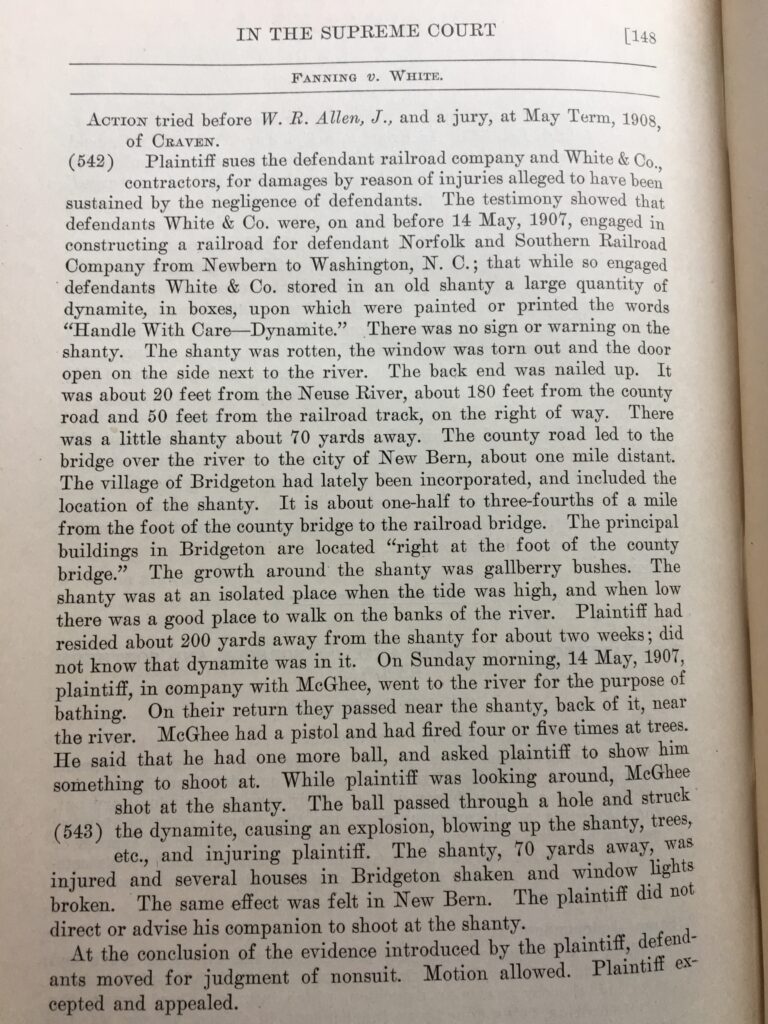 Forgive the digression, but I have to spend a minute or two on one of those cases, Fanning v. White and Norfolk and Southern Railway, 148 N.C. 541 (1908). The case stemmed from an incident involving “a large quantity of dynamite, in boxes, upon which were painted or printed the words ‘Handle With Care—Dynamite,'” stored in a “shanty” in a railroad right of way. The opinion itself describes the incident well: