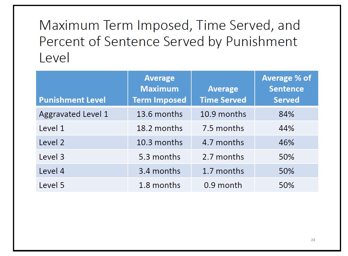 The chart may be of interest to judges and advocates alike as it reflects the average maximum term of imprisonment imposed for active DWI sentences at each level and the average percentage of those sentences that defendants served. (For DWI sentences, the maximum term of imprisonment is the significant number for most purposes. The minimum sentence is only relevant for purposes of determining a defendant’s eligibility for parole.) The average maximum term of imprisonment imposed for Aggravated Level 1 sentences was 13.6, only slightly above the statutory mandatory minimum of 12 months. Defendants served an average of 10.9 months. This reduction reflects (albeit slightly imprecisely) the statutory requirement that such defendants be released on post-release supervision four months before reaching the maximum term imposed. Aggravated Level 1 sentences are not parole-eligible and are not credited for good time.