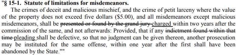 G.S. 15-1, v. 2.0. The statutory amendments are depicted in the image below. Amended G.S. 15-1 specifies that misdemeanors must simply be charged—rather than presented or indicted—within two years of the commission of the offense. Thus, under the amended version of the statute, it is clear that issuance of a citation or a magistrate’s order within two years of the offense would satisfy the statute of limitations.