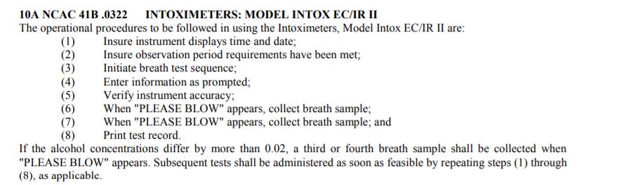 The operational procedures for conducting a breath test on the Intoximeter EC/IR II are set out in 10A NCAC 41B .0322.