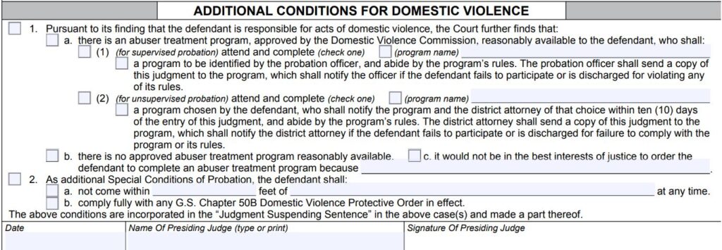 An unchecked box on page one does not, however, necessarily mean that the abuser treatment condition does not apply. The definition of domestic violence for probation purposes might also include (among other things) some of the crimes that can qualify as domestic violence under G.S. 15A-534.1 for pretrial release purposes, like domestic criminal trespass, kidnapping, and arson. (John Rubin discussed some of those offenses in this post, which provides helpful background.) Those crimes are not covered under G.S. 15A-1382.1, and so would not require the judge to check the box on page one. But if the judge concludes that they are included in the definition of domestic violence for probation purposes, the judge would be required to consider whether the abuser treatment condition applies under G.S. 15A-1343. Long story short, it’s not necessarily wrong for the court to add the abuser treatment program condition without checking the box on page one. But if the box on page one is checked, the condition probably should apply unless the court finds one of the exceptions below.