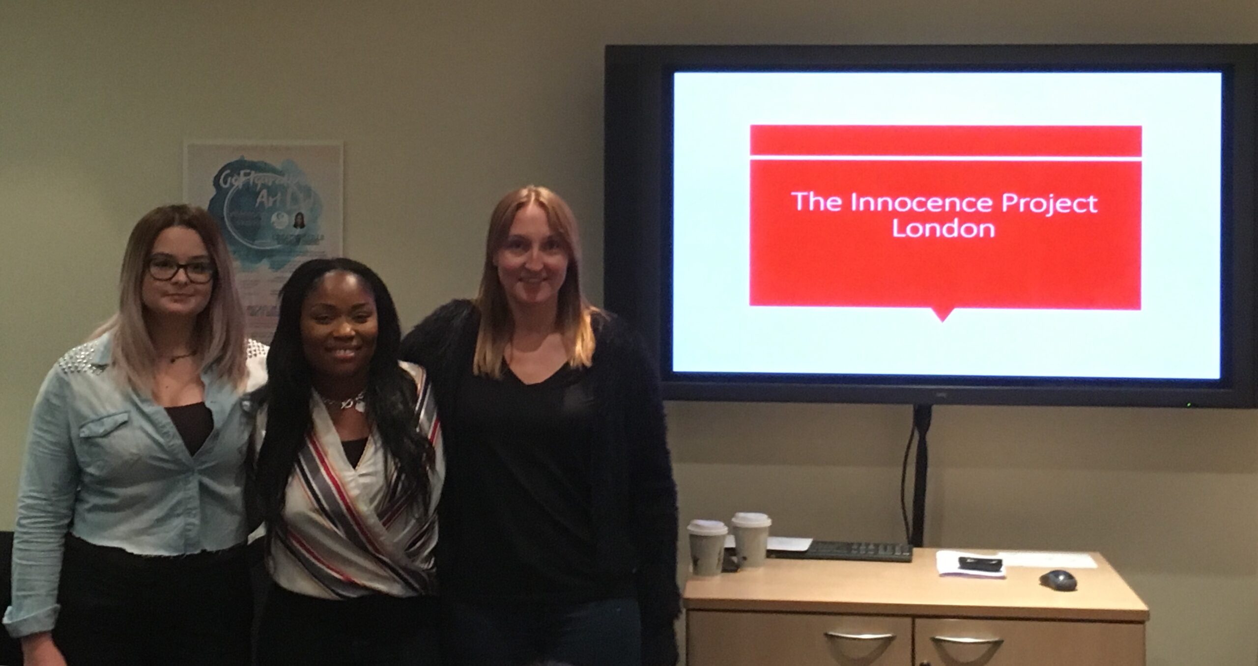 Criminal justice class continued uninterrupted. We heard from Louise Hewitt, a faculty member at the University of Greenwich School of Law and co-director of the Innocence Project London, and two of her students, Trudie Amarh and Lidia Stocia (from right to left).