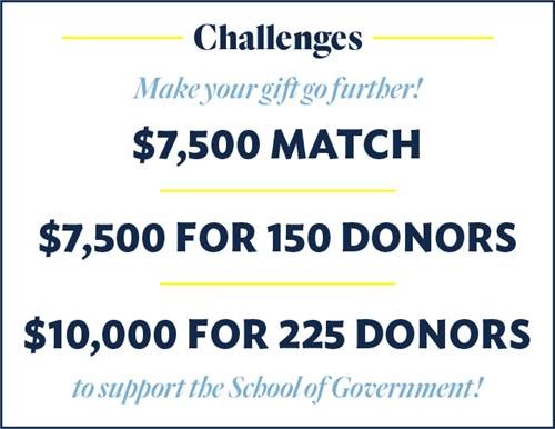 Today, you can help us reach even further. Your gift to the School of Government will be matched dollar for dollar, up to $7,500. Once we reach 150 donors, we’ll receive another $7,500 and then once we reach 225 donors—in celebration of the University’s 225th anniversary—we’ll receive another $10,000.