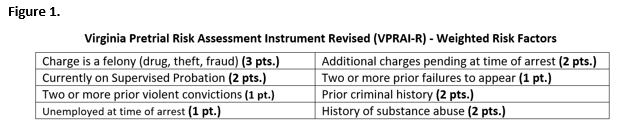 According to Cait, the most significant Orange County reform is implementation of an actuarial risk assessment tool for every defendant who has a first appearance, along with a decision making framework that pairs release conditions to assessed risk. The risk assessment tool adopted in Orange County is the Virginia Pretrial Risk Assessment Instrument-Revised (VPRAI-R). Although not all risk assessment instruments require an interview with the defendant, the VPRAI-R does. Thus, Ted interviews all defendants in jail prior to the first appearance. This includes not only defendants who have been arrested on new charges but also those arrested for probation violations and failures to appear. During the interviews, Ted provides information to defendants about the purpose of the upcoming first appearance hearing and gathers risk and needs information relevant to the judge’s determination of pretrial release conditions. Using the VPRAI-R, staff examine an established set of risk factors, such as whether the current charge is a felony and whether the defendant has prior failures to appear. Each risk factor is assigned a point value. The relevant risk factors and the points assigned to them are shown in Figure 1 below.