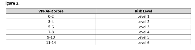 Points then are added together to determine the defendant’s risk level. The lowest risk level is 1; the highest is 6. Figure 2 below shows the conversion from raw score to risk level.