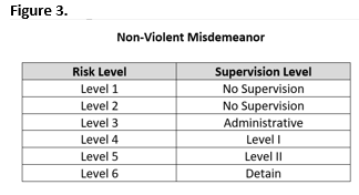 The defendant’s risk level in turn determines staff’s pretrial release recommendation. Specifically, staff consult a document called the VPRAI-R Pretrial Praxis, which sets out different supervision levels for each risk level for various categories of crimes. For example, Figure 3 below sets out recommended supervision levels for defendants charged with non-violent misdemeanors.