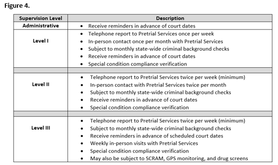 Although the County’s pretrial program is not new, it is an essential component of the local bail system. The County’s pretrial program offers four supervision levels: Administrative, Level I, Level II, and Level III, offering increasing levels of supervision. Figure 4 below summarizes these supervision levels.