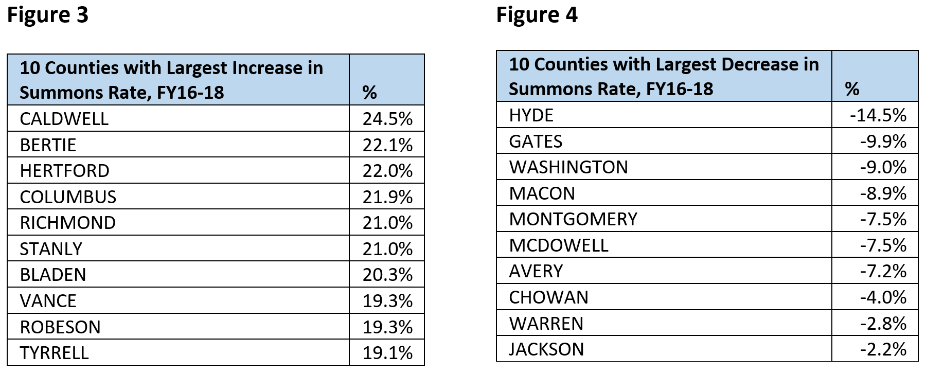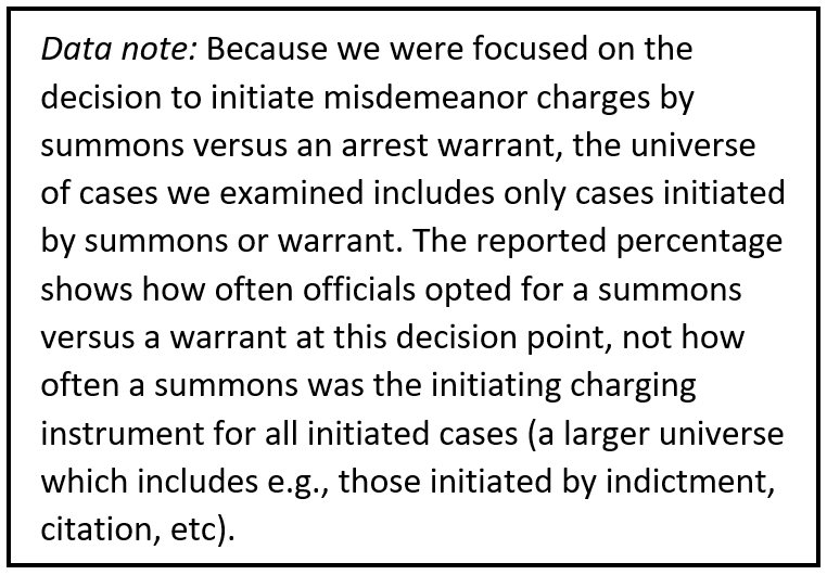 We end with three notes about the data. First, although we sought to limit our analysis to cases where the highest charge was a misdemeanor, our efforts may have been imperfect. We worked off of a NC AOC data set showing the initial process type issued for highest charge misdemeanor cases. When multiple charges are associated in a single case number, the system can limit the data set to highest charge misdemeanor cases. We understand, however, that in some counties multiple charges are not associated with the same case number. When this happens, the system cannot separate misdemeanor charges from associated felony charges because they are not linked through a common case number. Thus, some of the misdemeanor charges in our sample may have been associated with a felony. (To the extent this occurred we hypothesize that it would suppress summons rates.) Second, we sought to examine first process type (i.e. the process that initiated the case) and we understand that for the most part the data we received reflects that. However, we also understand that in some cases the clerk may have updated the relevant field to reflect a later process, such as a statement of charges. If that occurs, original charge information is overwritten and the charge would not be captured in our analysis (which looked only at highest charge misdemeanor cases where the initial process was a summons or arrest warrant). Finally, although a magistrate’s order is the proper process when an officer makes a warrantless arrest, we know that sometimes an arrest warrant is issued after a warrantless arrest. Instances where this occurred would be tracked as an arrest warrant issued by a magistrate (inflating those numbers), even though the initial decision to arrest was made by an officer.