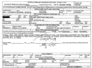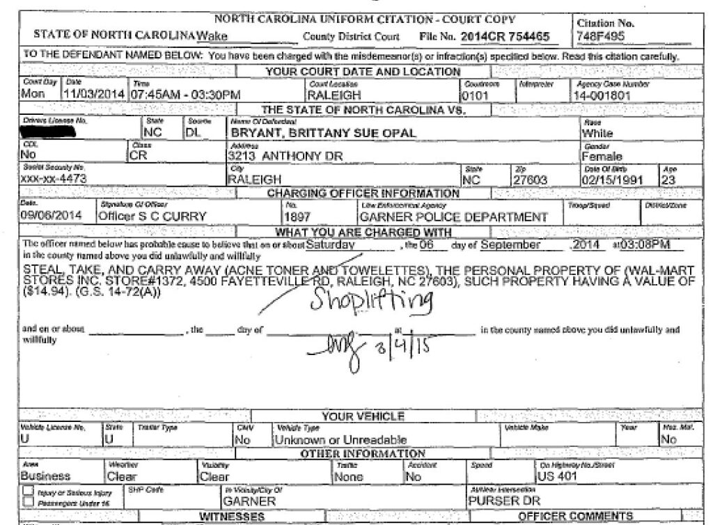 Brittany Bryant was charged with misdemeanor larceny for allegedly stealing acne toner and towelettes valued at $14.94 of from a Wal-Mart in Raleigh. The prosecutor agreed to reduce the charge from larceny to shoplifting. She accomplished that in a manner familiar to district court practitioners. She struck through the charging language of the citation, wrote in “shoplifting,” and initialed and dated the document. Bryant then pled guilty to shoplifting by concealing merchandise and was sentenced.