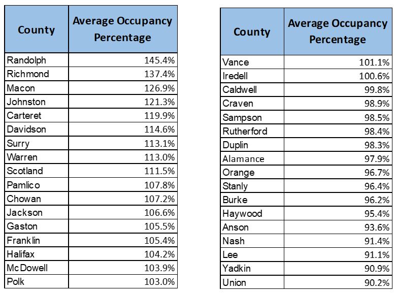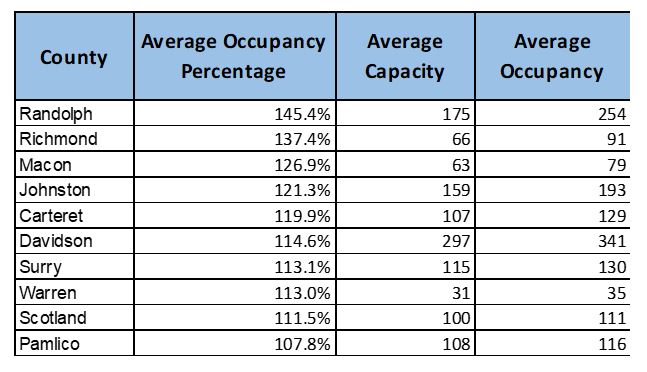 The data demonstrate that there is a significant spread in occupancy rates at both facility and county levels. With a range of 38.9% to 145.4%, NC counties are experiencing substantially different occupancy rates. A significant number of counties and facilities experienced occupancy in excess of official capacity either on average or during one or more months in 2018. Approximately 26% of counties and 19.5% of facilities were in excess of official capacity on average, and 50% of counties and 43.4% of facilities experienced excess occupancy for at least one month during 2018. These numbers grow significantly larger when including any facility or county above 90%. For both counties and facilities, a majority were above 90% at some point during 2018.