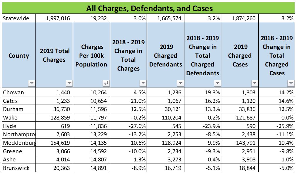 As expected, the number of charges in the state’s urban counties is higher than the number of charges in rural jurisdictions. To allow for more robust cross-county comparison, we added the data point of charges per 100,000 in population. Thus, while Mecklenburg County leads the state in total number of charges in 2019 (154,619), it is in the bottom 10 counties statewide with respect to charges per 100,000 population (see Table 1 below).
