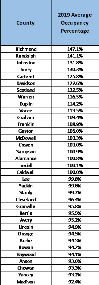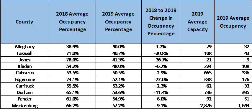 [1] Macon, Pamlico, and Wilson had operating facilities but did not report occupancy in 2019 and were excluded from this analysis. Beaufort’s capacity varied in 2019 and was excluded due to our inability to calculate occupancy.
