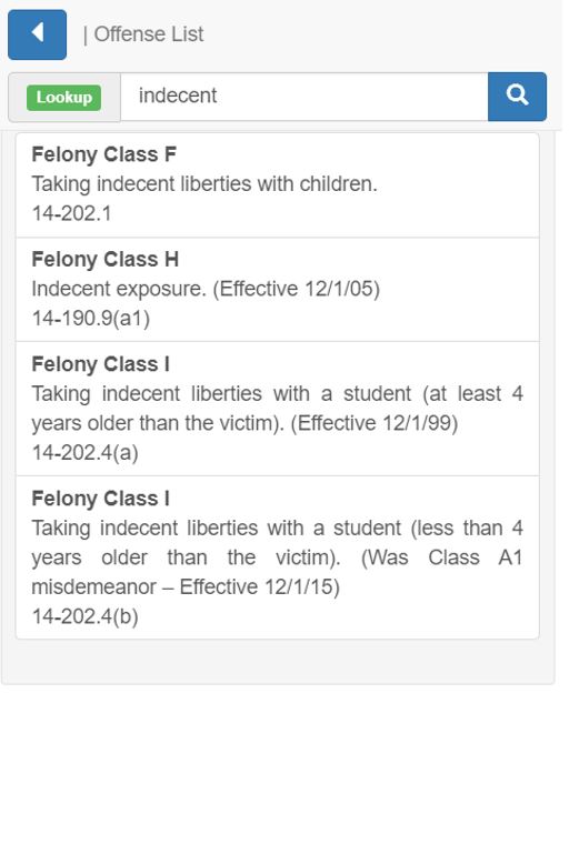 Or, with a new feature, you can select a particular offense from a searchable list of all North Carolina crimes.