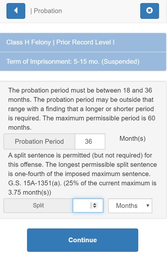 For probationary sentences, the app will warn you if your period of probation is too long. Or if your split sentence exceeds one-fourth of the maximum.
