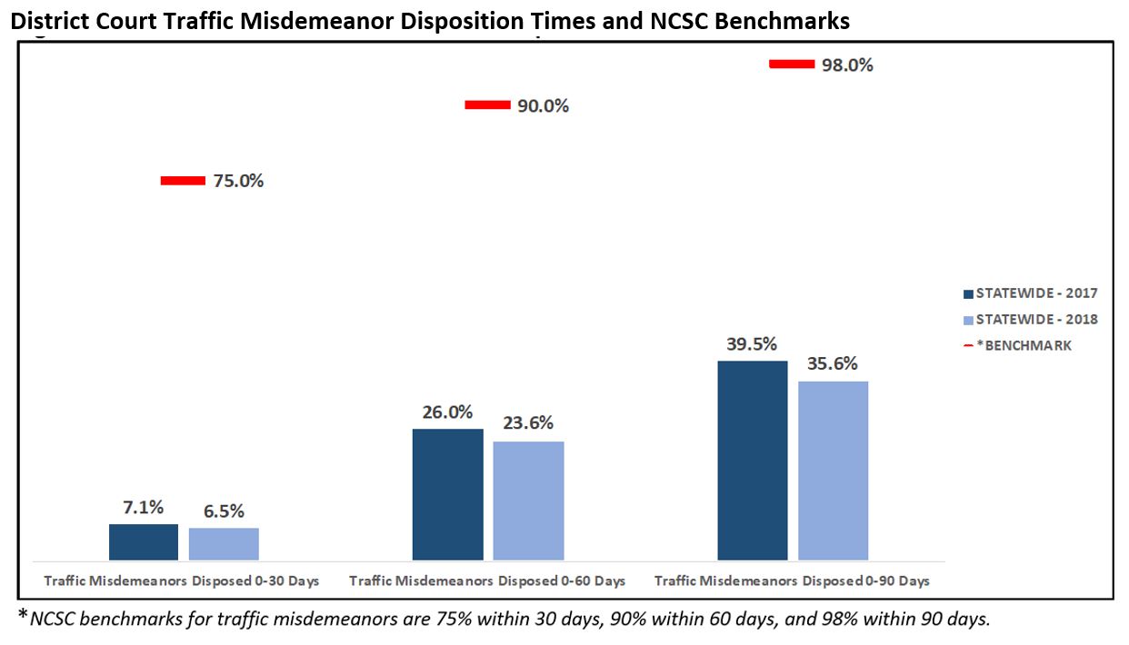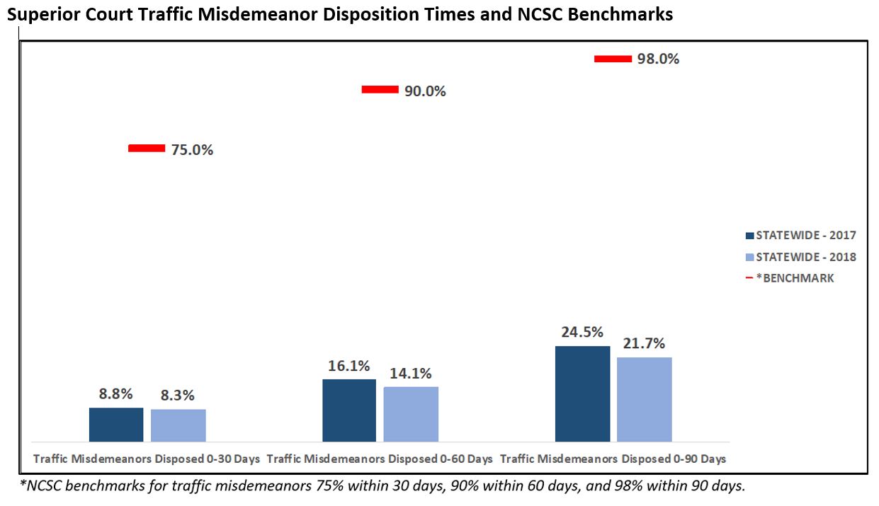 In 2018, the statewide median disposition time for non-traffic misdemeanors in superior court was 209 days; for traffic misdemeanors it was 207 days. Both metrics fall short of the NCSC Benchmarks.
