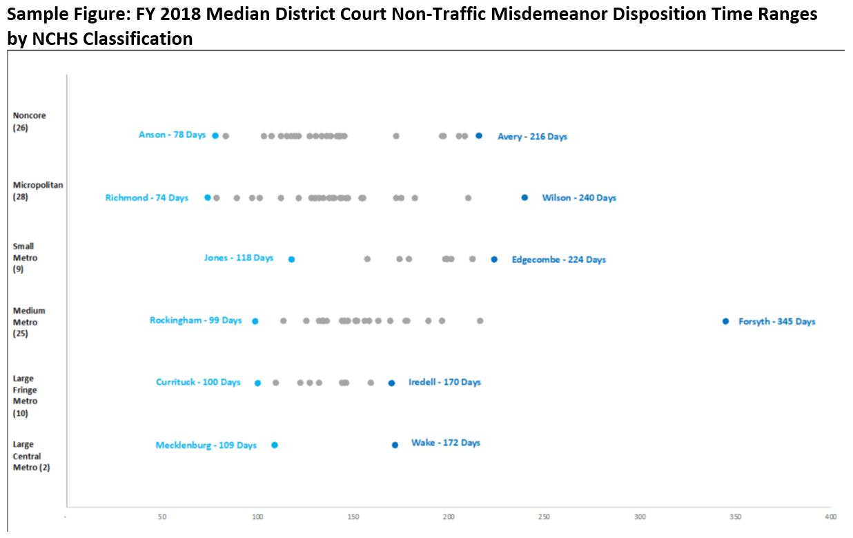 Because we are focused on helping stakeholders promote a fair and effective criminal justice system, our report contains several tools to help jurisdictions understand and improve disposition times. First, to help jurisdictions understand how disposition and pending case times are changing in their county, our spreadsheets present information over a range of years, and show changes in median disposition and pending case times. In the figure above, the colored columns show those changes, from 2017 to 2019. Second, to help jurisdictions understand how they are performing vis-à-vis their peer counties, we categorized each of North Carolina’s 100 counties using a federal classification scheme for rural-urban jurisdictions. We did so because we understand that factors such as frequency of court sessions, case volume and number of court personnel, can impact case processing times. Our report presents figures showing the range of disposition and pending case times within these various classifications. The figure immediately below is one example, showing median district court non-traffic misdemeanor disposition time ranges by rural-urban classification.