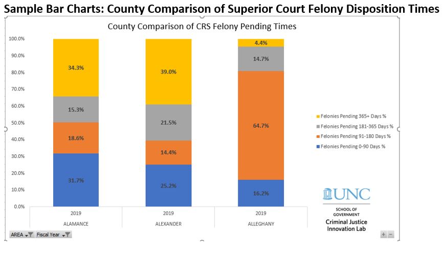 Finally, because we know that stakeholders will have their own ideas regarding which counties constitute their peer counties, our spreadsheet contains a tool that allows stakeholders to compare their county’s performance to any county or counties of their choosing. The figure below, for example, compares superior court felony disposition times across three counties: Alamance, Alexander, and Alleghany. Again, however, the spreadsheet tool allows you to compare any counties of your choosing, for district and superior court, across all case types.