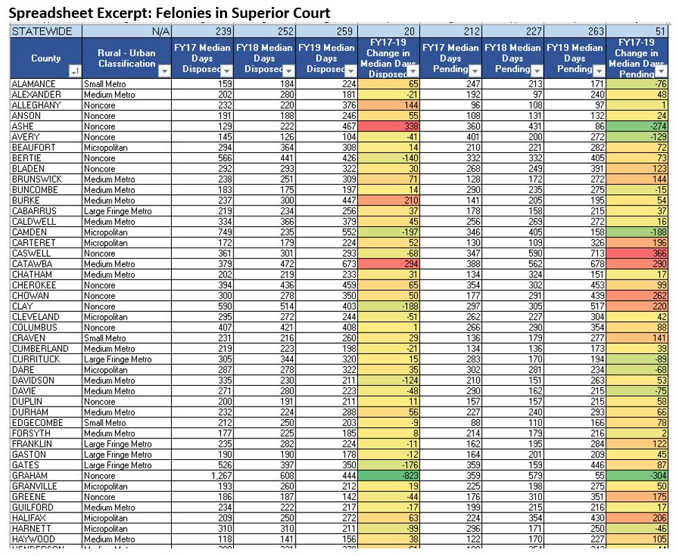 Our full report contains significantly more information. In addition to providing information about median pending case times, our report links to spreadsheets showing median disposition and pending case times at the county level in district and superior court for traffic misdemeanors, non-traffic misdemeanors, and felonies, across a range of years. The figure immediately below shows an excerpt from the superior court spreadsheet for felonies.