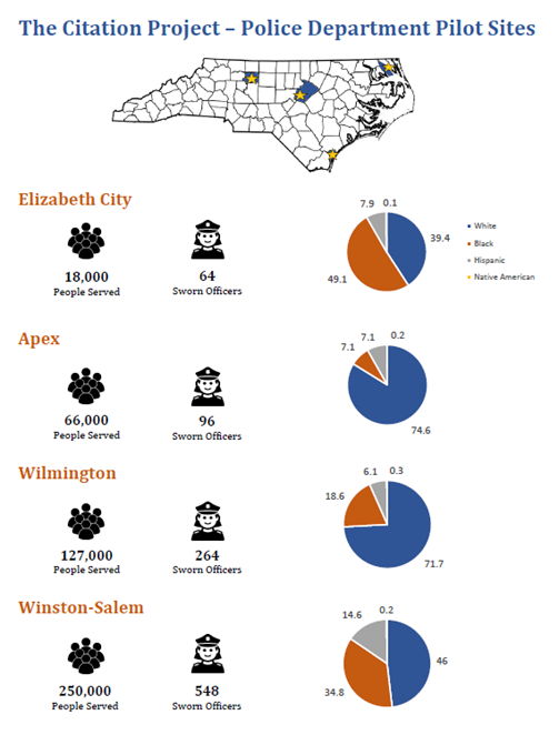 Back in July I wrote a post (here) inviting North Carolina police departments to apply to participate as pilot sites for The Citation Project. Executed by the UNC School of Government’s Criminal Justice Innovation Lab and the North Carolina Association of Chiefs of Police, The Citation Project seeks to improve policing practices through implementation and rigorous evaluation of a model citation in lieu of arrest policy. Four pilots sites have been selected. They include: Winston-Salem, Wilmington, Apex and Elizabeth City.