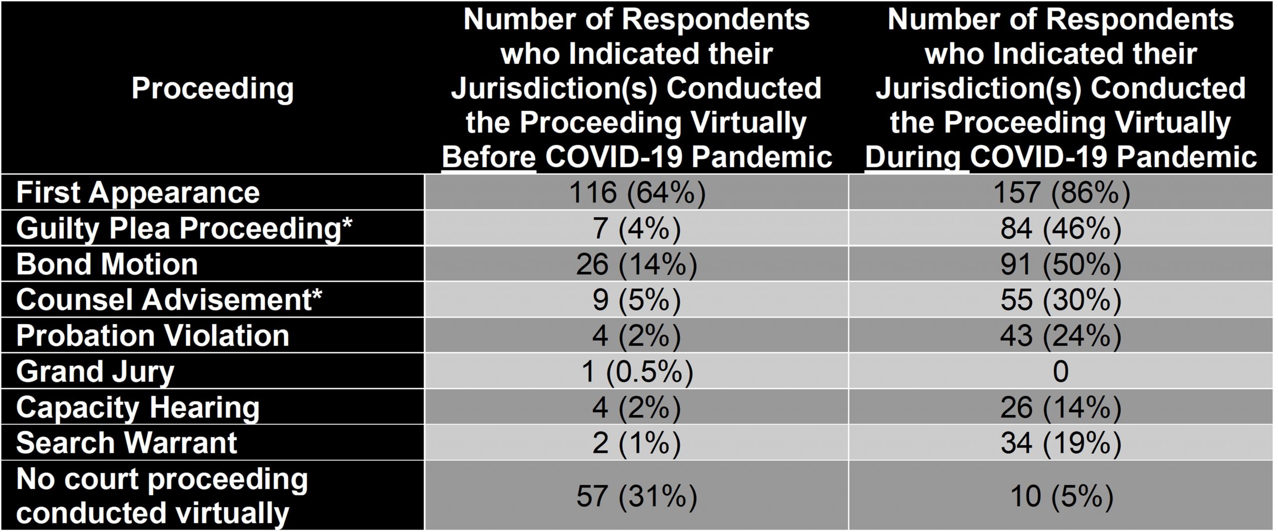 According to respondents, virtual first appearances were the most common type of virtual proceeding, both before and during the pandemic. Before the pandemic, relatively small numbers of respondents had participated in virtual guilty plea proceedings, bond motion hearings, counsel advisements, probation violation hearings, capacity hearings or search warrant proceedings. During the pandemic, some of those numbers changed considerably (Table 1).