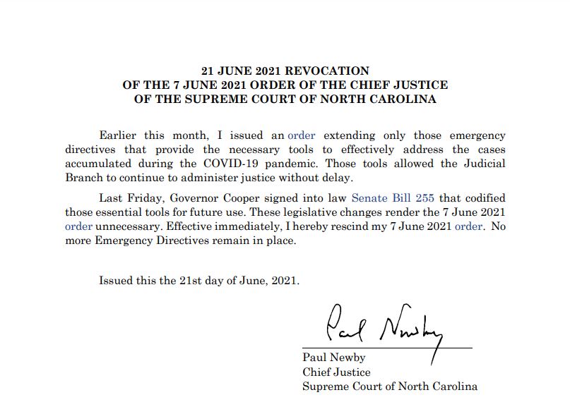 Earlier today, Chief Justice Paul Newby rescinded the two remaining COVID-19 Emergency Directives. The Chief Justice determined that the enactment of S.L. 2021-47 (Senate Bill 255) on Friday rendered unnecessary Emergency Directive 3, which authorized judicial officials to conduct proceedings that include remote audio and video transmissions and Emergency Directive 5, which permitted verification of pleadings and other documents by affirmation of the subscriber.