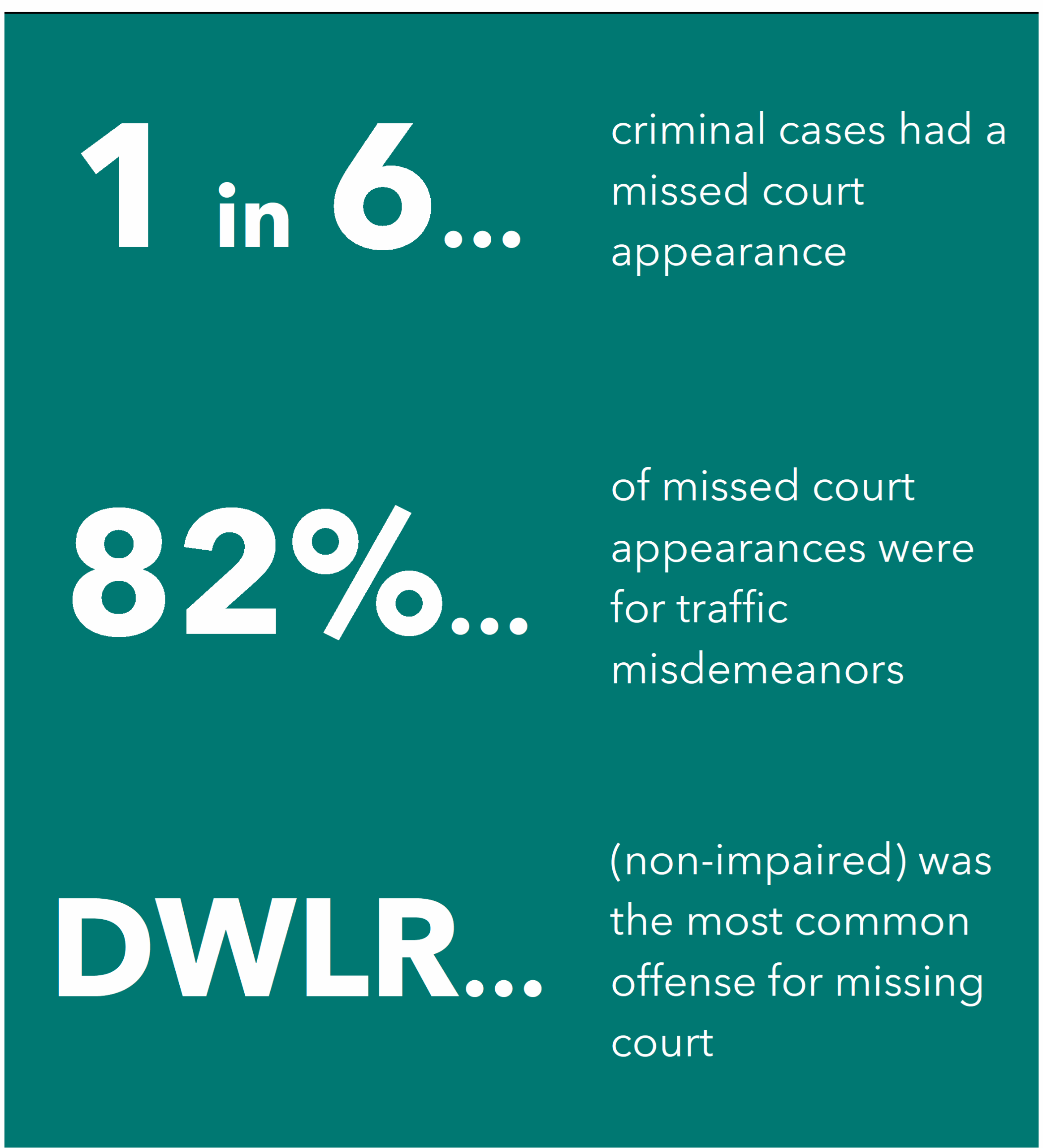 Traffic misdemeanors constituted the lion’s share of nonappearances (82%). Driving While License Revoked (Non-impaired) was the most common offense for missing court, followed by Expired Registration and Speeding. Together, these three offenses accounted for about half of all nonappearances. Put another way, about half of all nonappearances occur in low-level or administrative traffic offenses.
