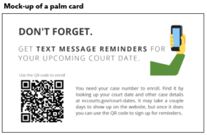 All three project teams recognized how improving court reminders could improve court appearance. And while the Administrative Office of the Courts launched a text and email reminder service in 2018, enrollment has been low. To improve enrollment in that system, project sites developed easy-to-read palm cards for justice system practitioners to distribute. Some project sites included additional information specific to the jurisdiction, such as courthouse location and available transportation services.