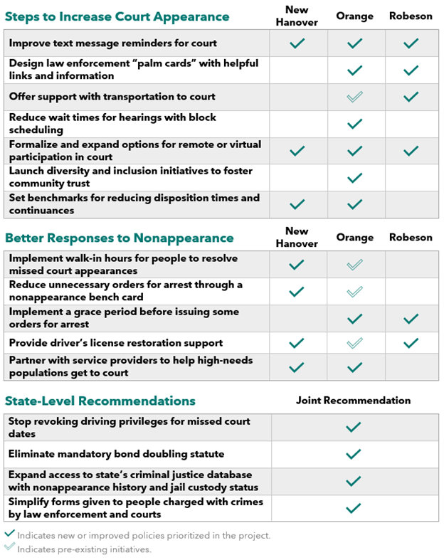 Diverse teams of justice system stakeholders in New Hanover, Orange, and Robeson counties participated in the North Carolina Court Appearance Project, seeking to improve local court appearance rates and develop better responses to nonappearances. The teams examined local court and jail data, reflected on court practices and procedures, and crafted policy solutions suited to the needs of their communities and courtrooms. We recently released a report describing the project teams’ initial efforts. This post summarizes key takeaways from that report.
