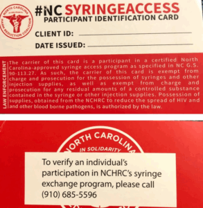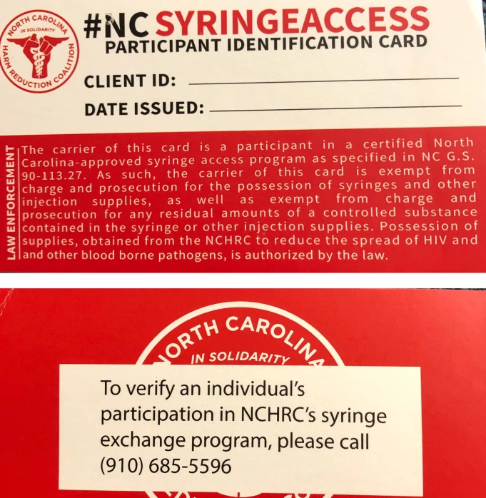 Participants in the program are provided written verification (usually in the form of a card) documenting that the injection supplies came from an authorized needle exchange program, which typically provides a phone number for law enforcement to verify the person’s participation in the program. Those cards can vary a bit in appearance but tend to look something like this:
