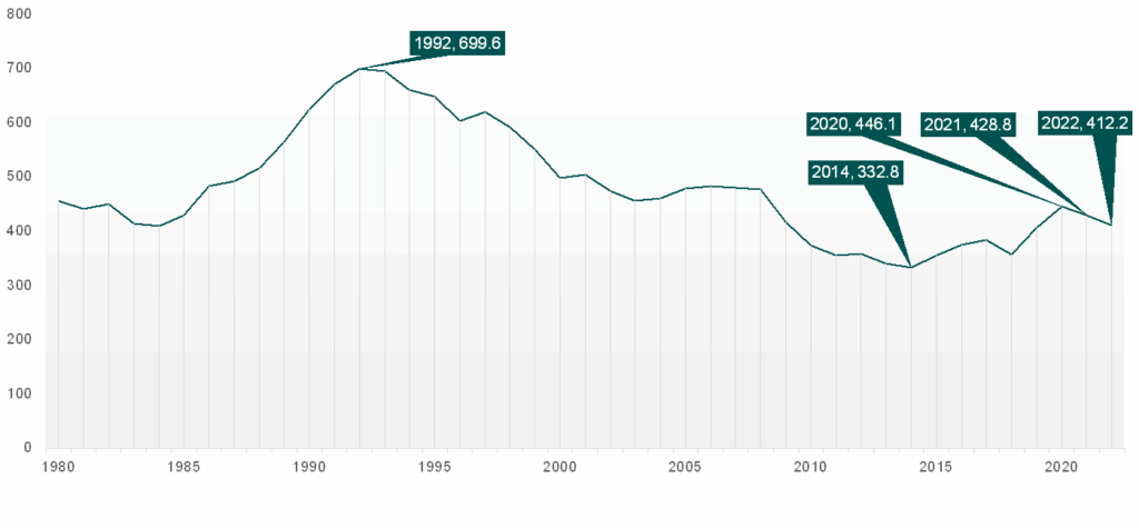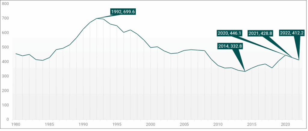 In 2022 the state’s index violent crime rate fell from the previous year, as was also the case in 2021. Figure 1 shows the rate of index violent crime per 100,000 people in North Carolina over 40 years.