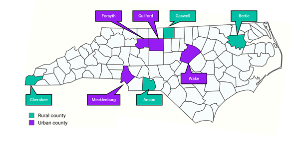 To explore this, I looked at those same police data over ten years for a set of urban and rural counties. Because of the national attention on urban crime, I looked at index violent crime trends in the four North Carolina counties with the largest populations: Forsyth, Guilford, Mecklenburg, and Wake. And because one in three North Carolinians live in a rural area, I also looked at trends in four rural counties that were both geographically diverse and have complete data for the past ten years: Anson, Bertie, Caswell, and Cherokee (see Figure 2).