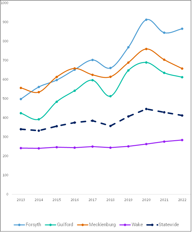 Additionally, there is considerable variation in violent crime rates for these counties. For example, in 2022, the index violent crime rate for Forsyth was three times Wake County’s rate.