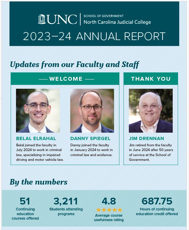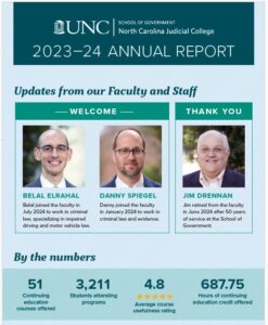 In addition to showcasing officials’ reviews of these and other educational programs, the report features new publications from our faculty, including a new edition of Arrest Warrant and Indictment Forms, a digital edition of Arrest, Search, and Investigation in North Carolina, and North Carolina Magistrates’ Guide to Pretrial Release.