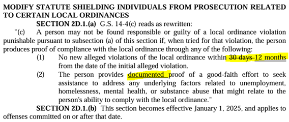 Second, whereas the other means to establish an affirmative defense previously required proof of certain underlying factors, the amendment now requires documented proof of those facts. Chapter 14 does not define “documented.” Two canons of statutory construction may be useful. A basic rule of statutory interpretation is to give language its plain meaning where a statute is unambiguous. See Sturdivant v. N.C. Dep’t of Pub. Safety, No. 130PA23-1, at 7 (N.C. Dec. 13, 2024). Merriam-Webster defines the verb “document” as “to furnish documentary evidence of” or “to provide with factual or substantial support for statements.” Similarly, Oxford offers the following definition: “to record something in the form of a written document, film, photograph, etc.” The surplusage canon of statutory construction also dictates that no word in a statute should be ignored and each word should be given full effect. See In re LL, No. 333PA23-1, at 10 (N.C. Dec. 13, 2024). Presumably, then, “documented proof” must mean something more than proof. The amendment probably requires some form of documentation, not merely testimony, to mount a defense to an alleged ordinance violation under this prong. In the instance of unemployment, for example, a copy of an unemployment check or a letter of termination of employment may suffice. For the factors of mental health or substance abuse, perhaps a medical diagnosis or invoice from a treatment facility would constitute “documented proof.” One could imagine an eviction notice, intake records from a shelter, or a photograph of temporary living conditions from an unhoused person as adequate documentation.
