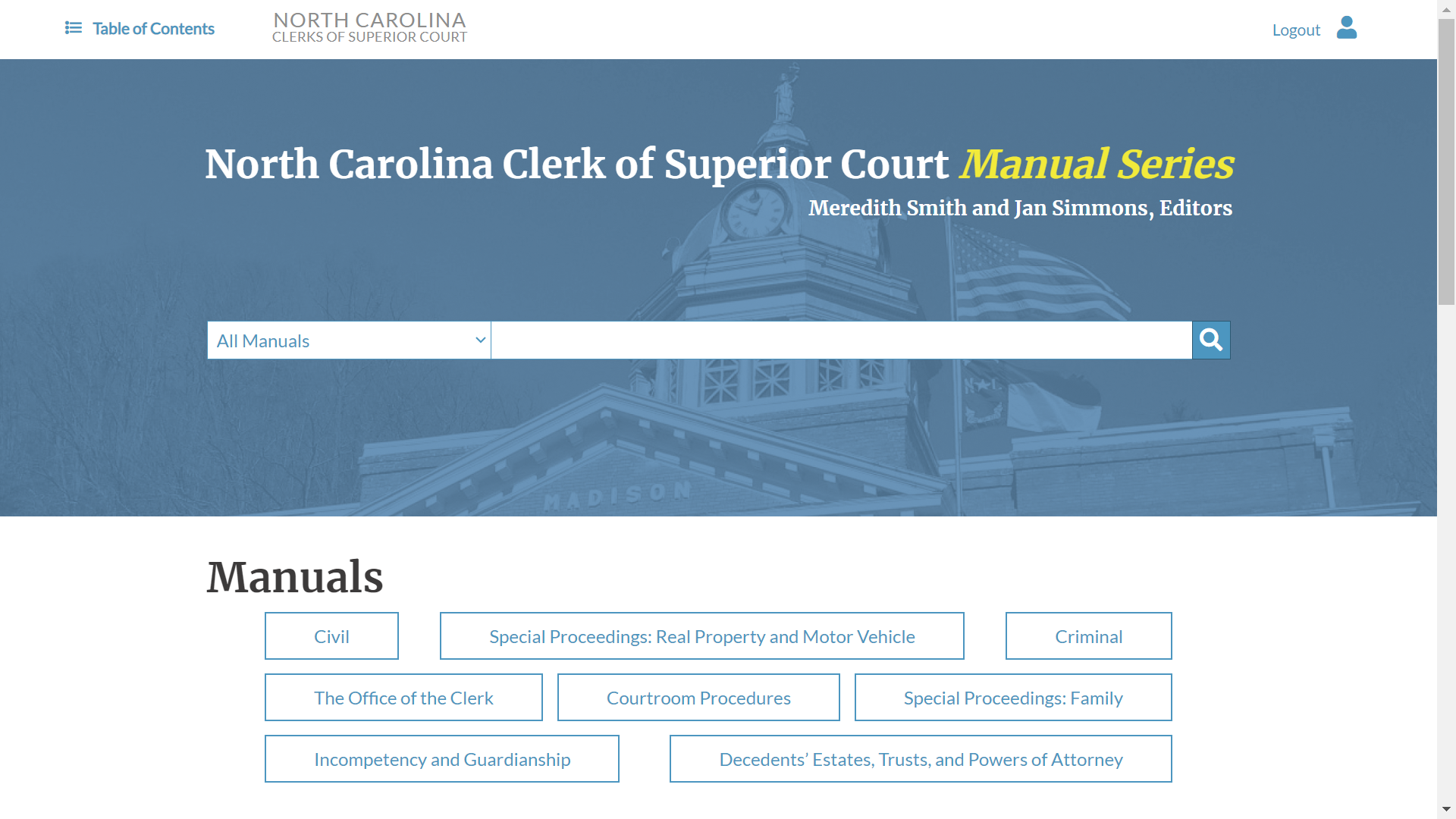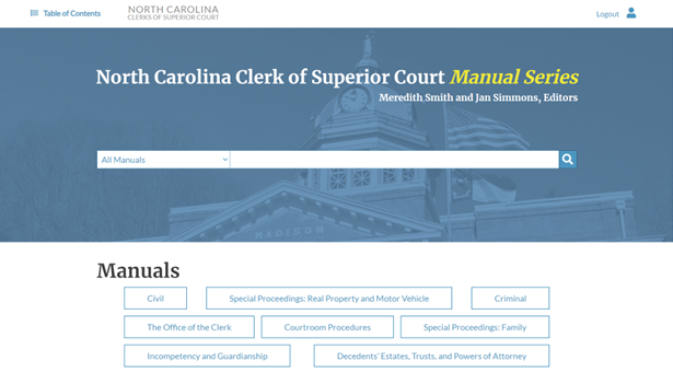The North Carolina Clerk of Superior Court Manual Series is a web-based collection of reference manuals for clerks of superior court and their assistants and deputies. While broad in scope, the manual series does not attempt to deal with all duties of the clerk. Instead, it primarily sets out the law related to judicial proceedings that clerks conduct.