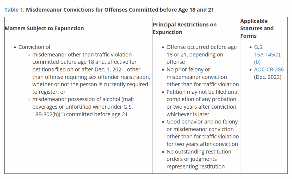 With a teaser like that, who could resist reading more? The 2025 edition of my online guide to expunctions is now available on the School of Government’s website at https://www.sog.unc.edu/resources/microsites/relief-criminal-conviction/. It is a free resource on expunctions and other forms of relief from the consequences of a criminal conviction. Compared to previous years, the 2024 legislative session was relatively quiet on the expunction front, but the General Assembly made some important changes, discussed briefly below and in more detail in the revised guide.