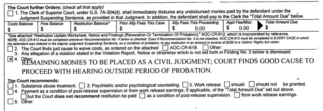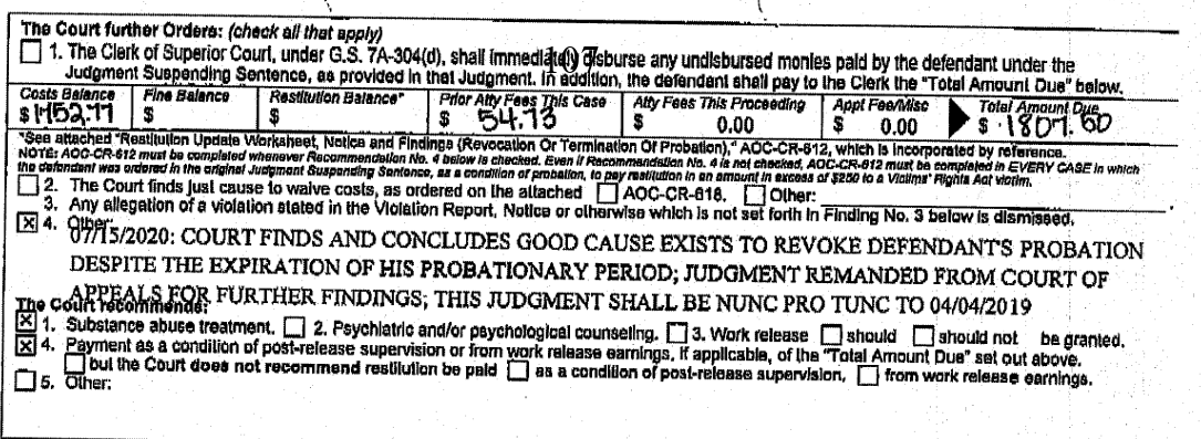 Finally, as far as memorialization of good cause findings goes, as noted in my earlier posts on this topic, there is no check-box or dedicated space on the revocation or modification order forms for the court to record its findings. So for now, the court will need to record its findings somewhere in the free text space on the form. In Geter, the court wrote “THE COURT FINDS AND CONCLUDES GOOD CAUSE EXISTS TO REVOKE DEFENDANT’S PROBATION DESPITE THE EXPIRATION OF HIS PROBATIONARY PERIOD” in the “Other” block on the revocation order.