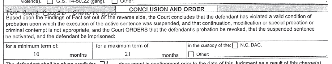 It’s the “good cause shown and stated” prong that has been wreaking a bit of probationary havoc. In State v. Morgan, 372 N.C. 609 (2019), the supreme court unanimously held that G.S. 15A-1344(f)(3) means what it says—a court has jurisdiction to act on a probation violation after expiration only if it makes a finding of good cause. After Morgan, dozens of cases have been vacated for lack of the required finding. See State v. Brewington, 911 S.E. 2d 405 (2025) (unpublished); State v. Siler, 295 N.C. App. 262 (2024); State v. White, 902 S.E.2d 364 (2024) (an unpublished conditional discharge case, indicating that the issue applies with equal force in that context); State v. Carpenter, 900 S.E.2d 239 (2024) (unpublished); State v. Hammond, 900 S.E.2d 417 (2024) (unpublished); State v. Leggette, 898 S.E.2d 383 (2024) (unpublished); State v. Pratt, 896 S.E.2d 761 (2024) (unpublished); State v. Jackson, 291 N.C. App. 116 (2023); State v. Black, 892 S.E.2d 511 (2023) (unpublished G.S. 90-96 case); State v. McSpadden, 891 S.E.2d 507 (2023) (unpublished); State v. Lytle, 287 N.C. App. 657 (2023).