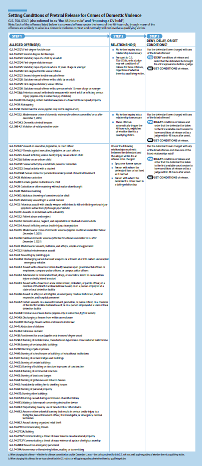 Also included are charts for (1) issuing a domestic violence protective order (DVPO) pursuant to G.S. 50B-1 and (2) issuing a charge for the misdemeanor crime of domestic violence pursuant to G.S. 14-32.5. These charts are included primarily to distinguish the lists of qualifying relationships between the three statutes (G.S. 15A-534.1, 50B-1, and 14-32.5).