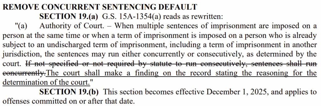 Under G.S. 15A-1354(a), “[w]hen multiple sentences of imprisonment are imposed on a person at the same time or when a term of imprisonment is imposed on a person who is already subject to an undischarged term of imprisonment, including a term of imprisonment in another jurisdiction, the sentences may run either concurrently or consecutively, as determined by the court.” Previously, the law went on to say that “[i]f not specified or not required by statute to run consecutively, sentences shall run concurrently.” Effective for offenses committed on or after December 1, 2025, that provision is deleted, with the result being that there is no default under G.S. 15A-1354. Instead, a new provision is added stating “[t]he court shall make a finding on the record stating the reasoning for the determination of the court.” S.L. 2025-70, section 19.(a). So, the court must decide whether the sentence being imposed will run concurrently with or consecutively to other sentences being imposed at the same time, as well as any other existing terms of imprisonment.