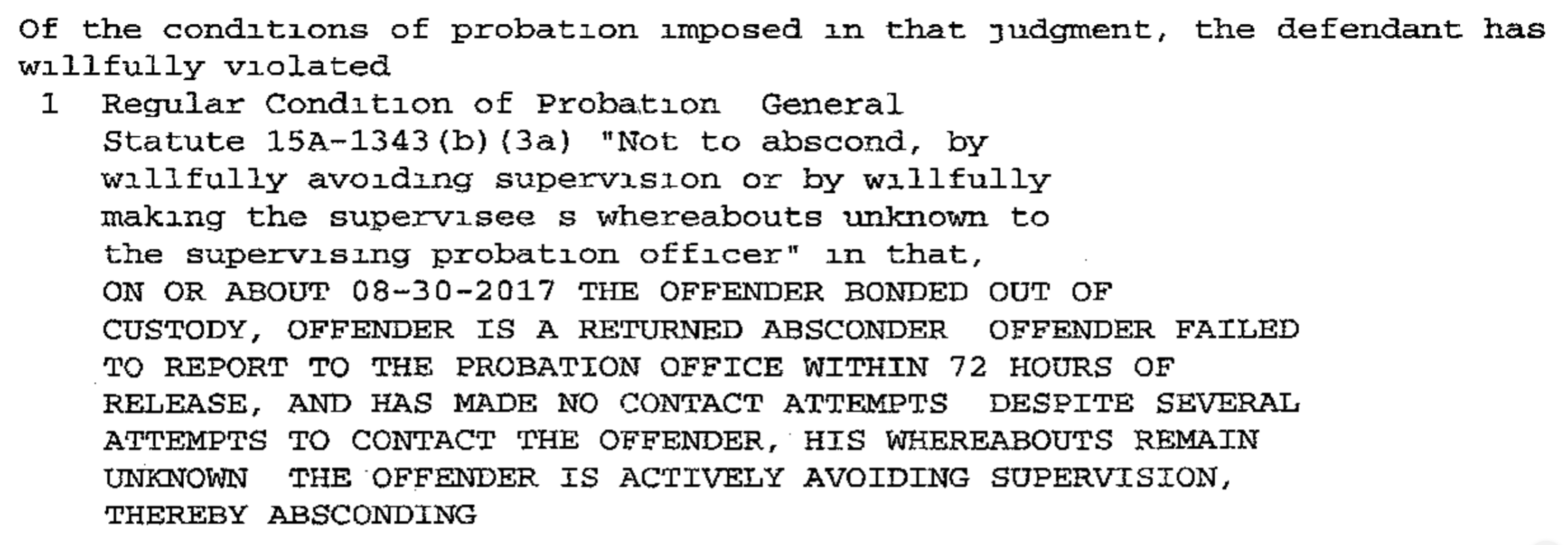 On appeal, the defendant argued that the alleged violating behavior was, at its core, merely failing to report for an office visit. And in light of State v. Williams, 243 N.C. App. 198 (2015) (discussed here), and State v. Krider, __ N.C. __ (2018) (discussed here), missed appointments alone are technical violations, not revocation-eligible absconding. Slip op. at 9.