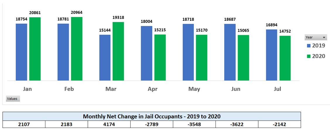 As shown in Figure 1 below, in January and February 2020, jails statewide were detaining over 20,000 people. These numbers were higher than those for the same months in 2019. In March 2020, the beginning of the COVID-19 pandemic, jail detentions statewide dropped to 19,318. By April 2020, statewide jail detentions had dropped to 15,215, and have continued to fall, albeit at a slower rate, monthly through July 2020. Statewide detention rates for April, May, June, and July 2020 were below detention rates for the same months in 2019.
