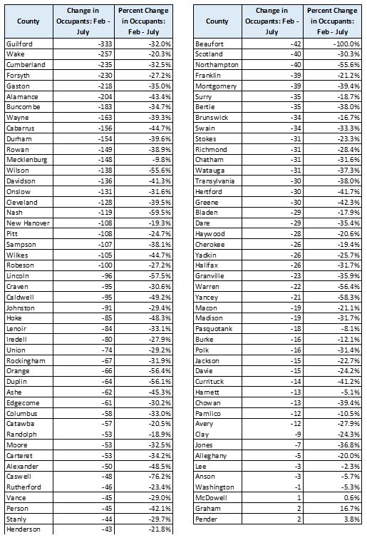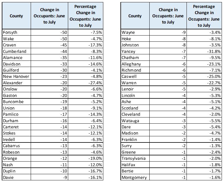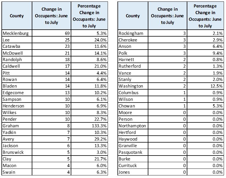We have issued a series of reports on North Carolina state and county-level jail occupancy rates, including one in July 2020 focusing on changes in jail occupancy rates during the early months of the COVID-19 pandemic (here, here and here). In this report, we switch our reporting metric and focus on changes in occupants as opposed to occupancy rates. We also provide a new tool for stakeholders to examine changes in county jail populations during the COVID-19 period.